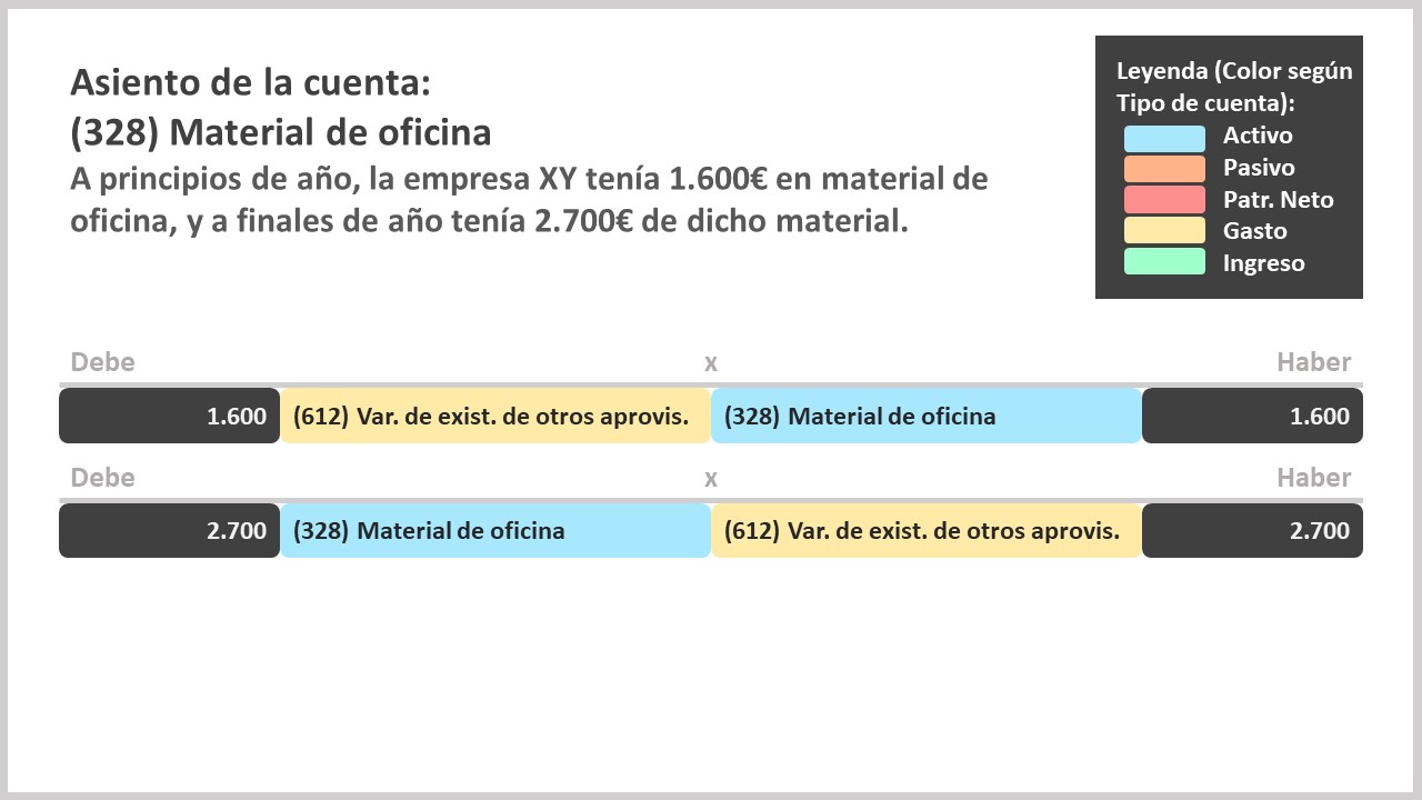 La cuenta 328 Material de oficina, es una cuenta del grupo 3 de existencias, a la vez que pertenece al subgrupo 32 otros aprovisionamientos. Una cuenta de activo corriente que figurará en el balance de situación, y que crece por el debe y decrece por el haber.